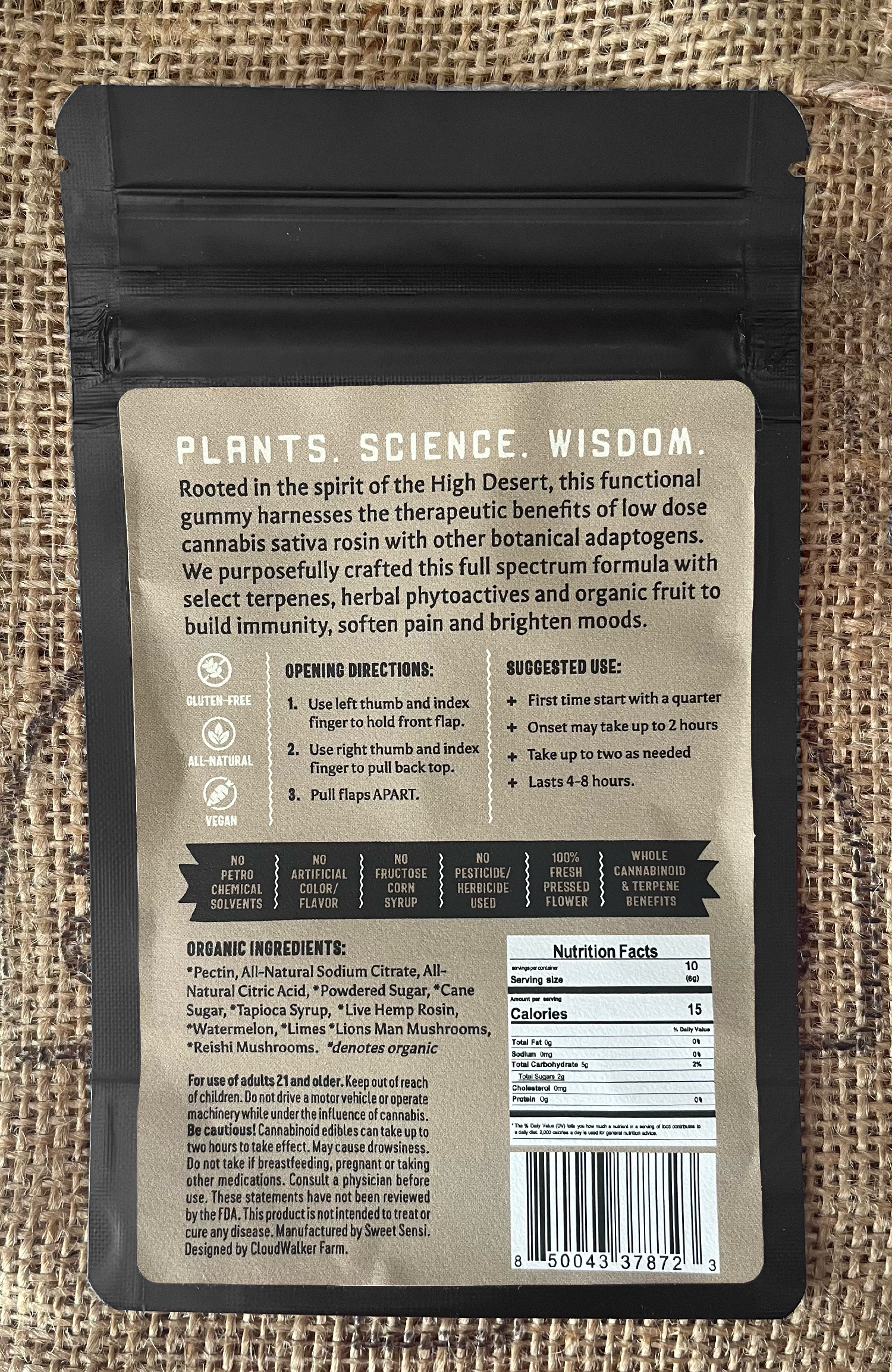 ORGANIC INGREDIENTS: *Pectin, All-Natural Sodium Citrate, All-Natural Citric Acid, *Powdered Sugar, *Cane Sugar, *Tapioca Syrup, *Live Hemp Rosin, *Watermelon, *Limes, *Lion's Mane Mushrooms, *Reishi Mushrooms.